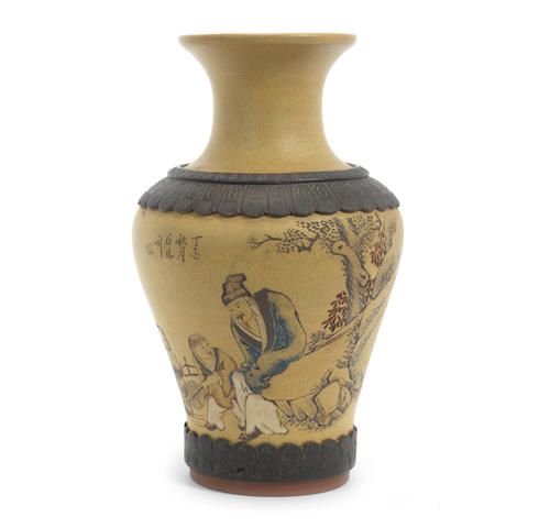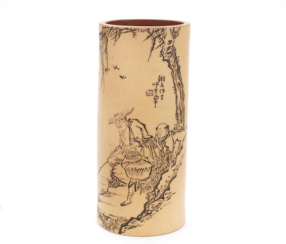 Yixing Vase and Brush Pot with inscribed line drawings by Ren Ganting. Bonhams Fine Art Auction, London.