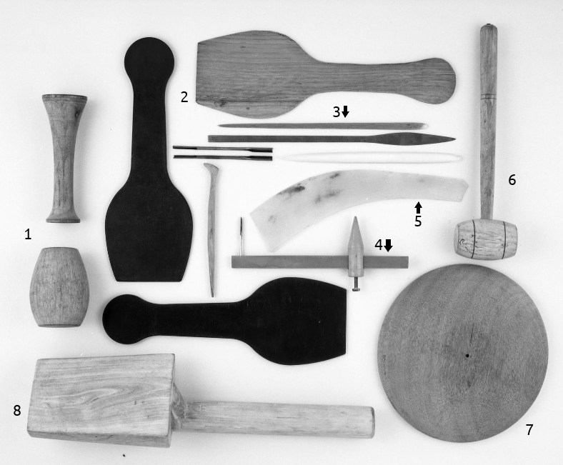 Sixteen tools of Yixing, collected in 1990 – 1994, in wood, metal, horn, and plastic. The British Museum, London. List of Tools: 1) pedestals on which an upside-down teapot may be supported by the base; 2) flat spatula for shaping teapots and thinning clay sheets; 3) bamboo and metal picks for probing, making holes, and engraving lines in the clay; 4) caliper for measuring and cutting; 5) mingzhen scraper made from buffalo horn 6) hammer used with another tool to emboss designs onto a teapot, including the chop; 7) display wheel; 8) mallet used for flattening clay.